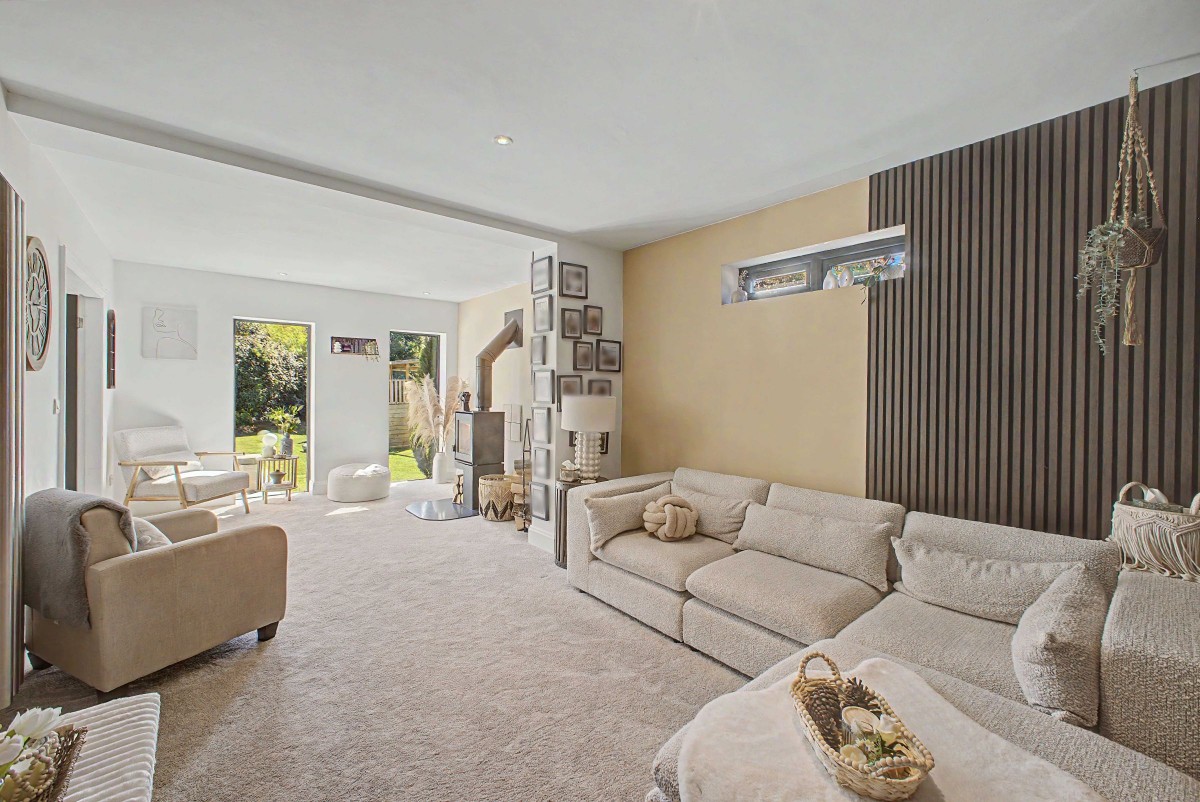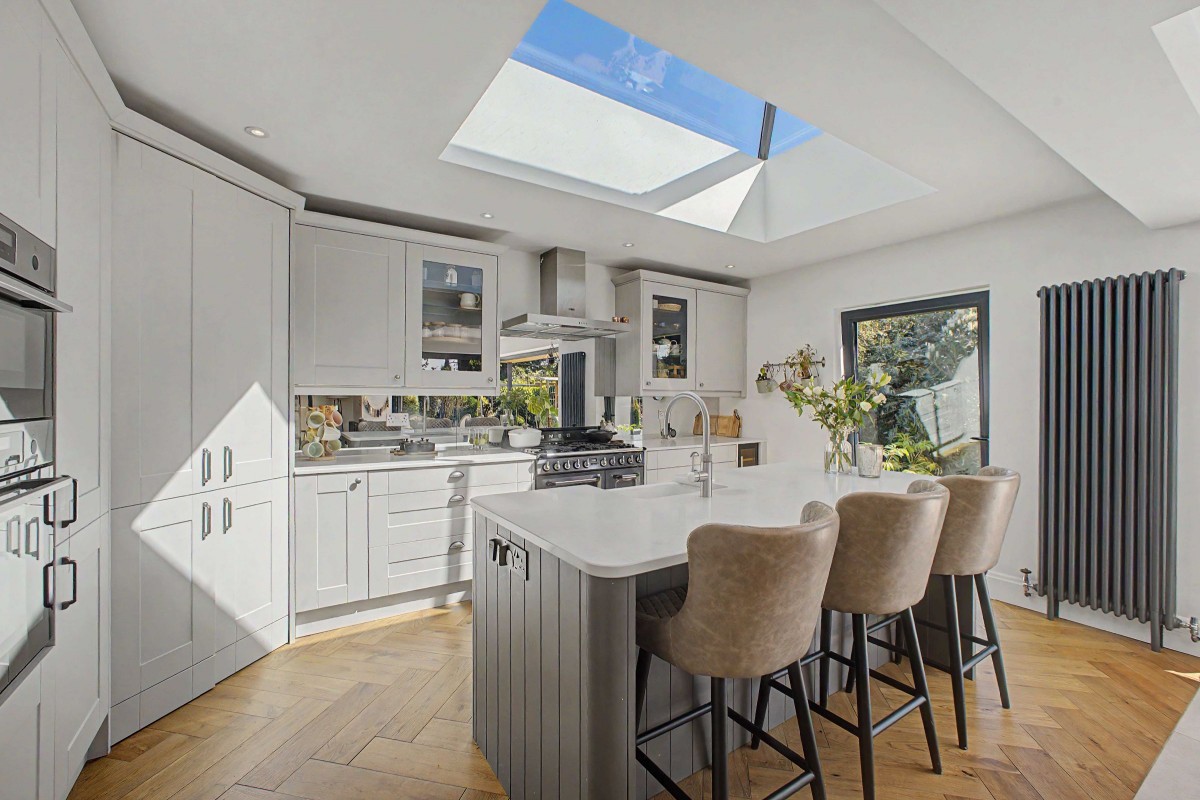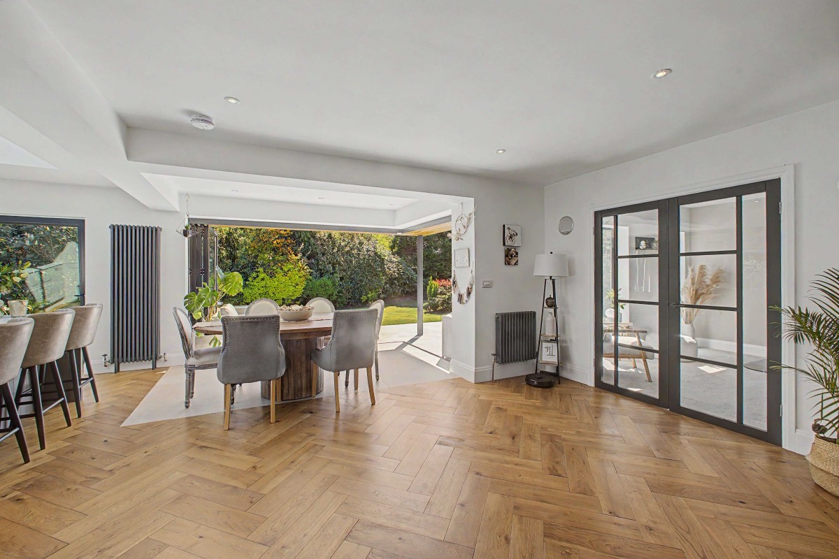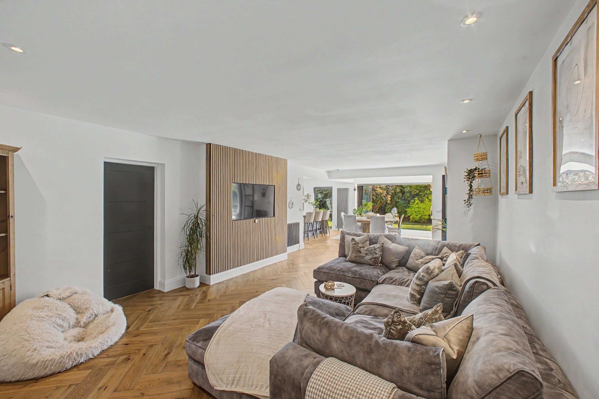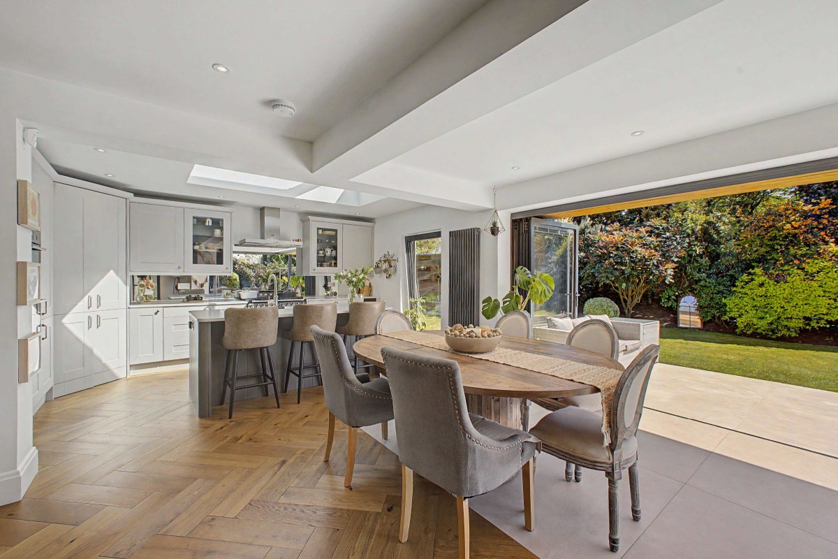 To the rear lies the true heart of the home: a stunning, extended open-plan kitchen, dining, and living area. This expansive space is flooded with natural light, thanks to striking corner bi-fold doors and a large skylight positioned above the kitchen island. Designed with both everyday living and entertaining in mind, this area seamlessly connects the indoors with the garden and benefits from a built-in Bang & Olufsen sound system.