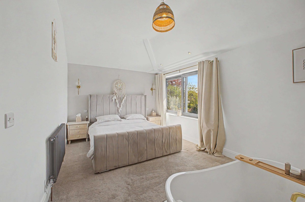 Upstairs, the property continues to impress with four generously sized double bedrooms. The master suite is a standout feature, offering a luxurious and contemporary layout with a freestanding bath positioned opposite the bed, partially separated by a feature wall. Beyond this lies a dedicated dressing area with fitted wardrobes and an open ensuite complete with a shower.