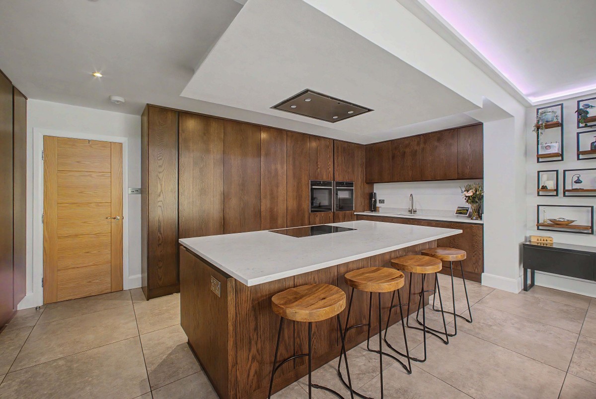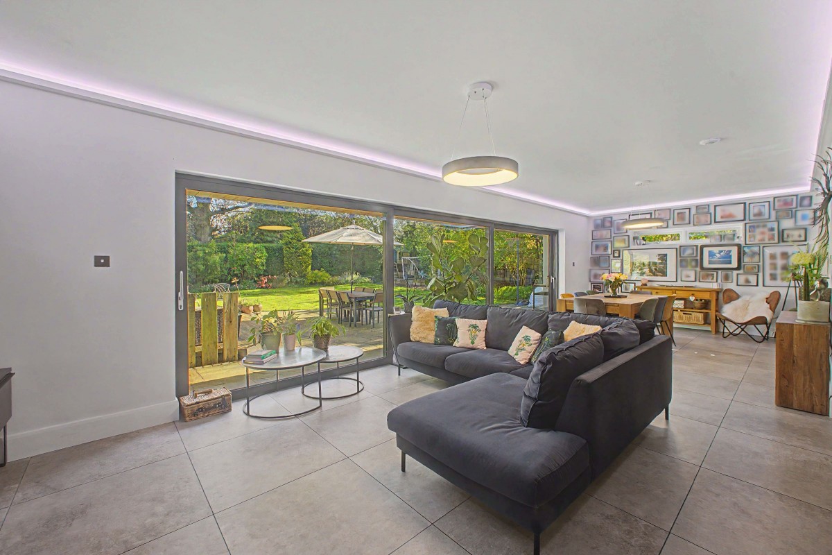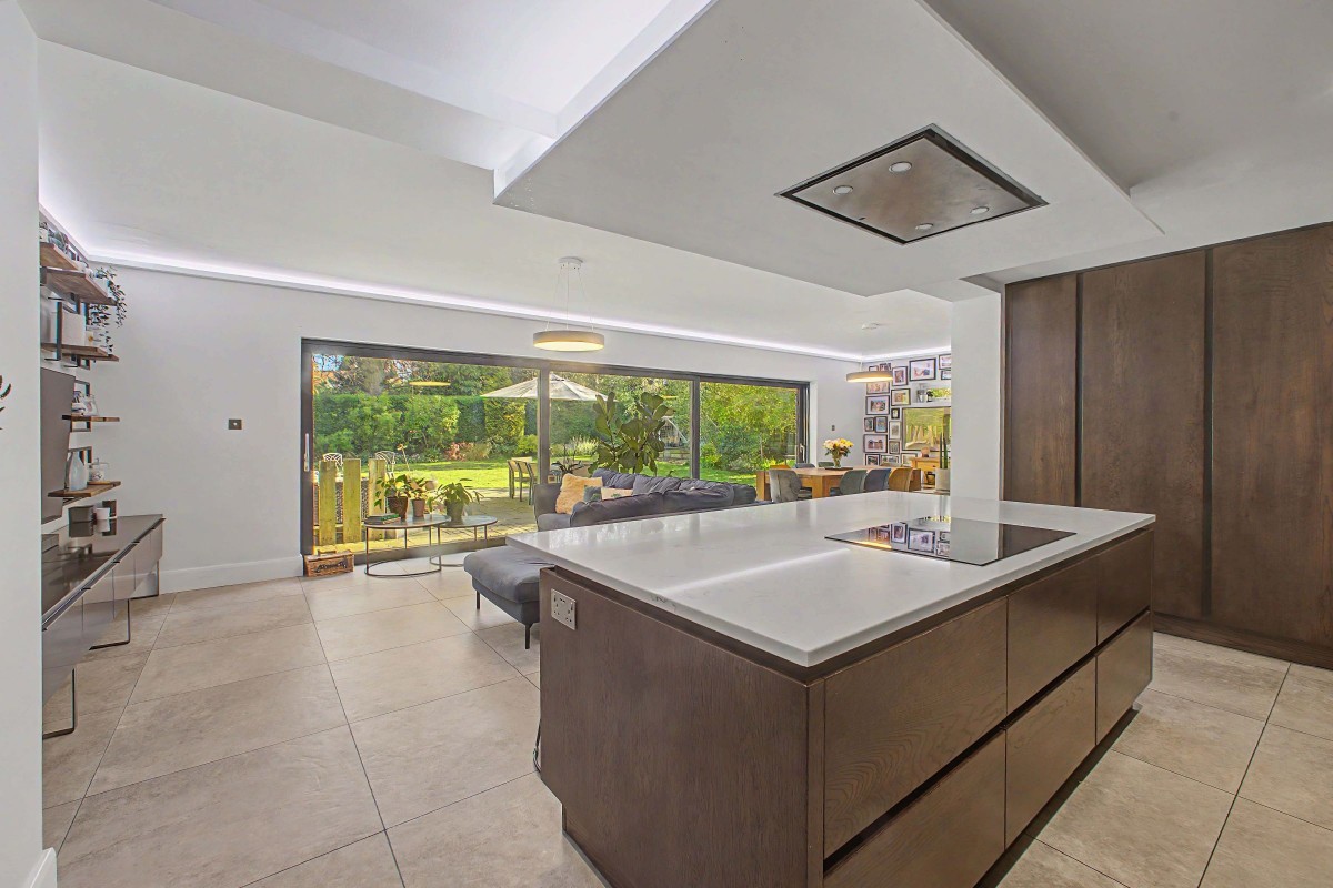 At the heart of the property lies a spectacular open-plan living/dining kitchen - a space designed not only for cooking, but for gathering, entertaining and day-to-day living. This beautifully appointed kitchen features high-specification appliances, extensive work surfaces and a substantial central island that naturally becomes a focal point for both family life and social occasions. The open-plan design flows effortlessly into the dining and living areas, creating a sociable and inviting environment. Large sliding doors span the rear elevation, drawing in an abundance of natural light and opening directly onto the garden, allowing the interior and exterior spaces to connect seamlessly during warmer months.